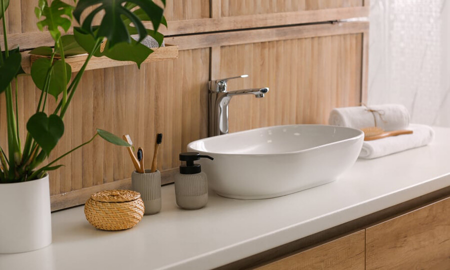 - Экономия пространства. Благодаря тому, что вся сантехническая арматура спрятана под столешницей, на поверхности остается больше места для хранения различных принадлежностей.