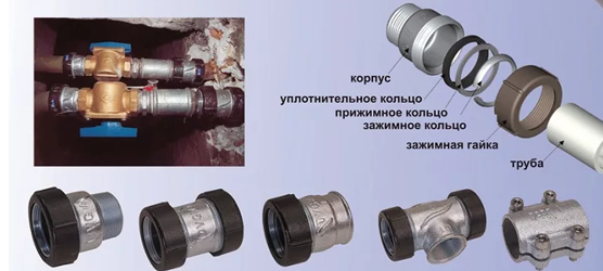 Компрессионные: Сжимающие элементы обжимают трубу в муфте, создавая герметичное соединение.